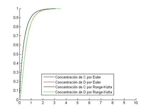 legend('Concentración de C por Euler','Concentración de D por Euler','Concentración de C por Runge-Kutta','Concentración de D por Runge-Kutta','Location','best')