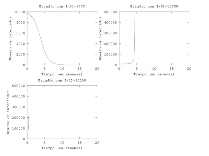 Para seguir el estudio con una aplicación numérica, se fija el número de habitantes N de la ciudad en 500.000. También se sabe que en el instante inicial de la propagación hay 200 personas infectadas y que tras la primera semana se contabilizan 300 nuevos casos.