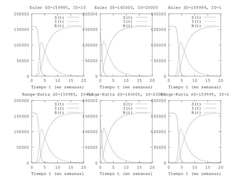 Tras este preliminar se dispone de todo lo necesario como para dibujar la curva del número de infectados I(t), para lo que se recurre a aplicar el método de Heun y el método de Runge-Kutta de rango 4.