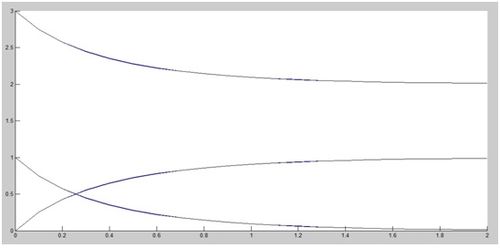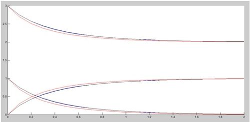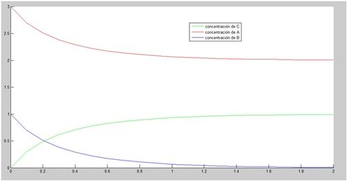 Una vez llegados a este punto, se procede a ver una interpretación gráfica de la reacción. Para ello, se refleja en la gráfica (en un intervalo de 2 segundos), cómo varían las concentraciones tanto de [math]A[/math] ([math]a_0[/math]=3 mol/L) y [math]B[/math] ([math]b_0[/math]=1 mol/L) como de [math] C[/math], para una [math]k_1[/math]=1 mol/s. Se comienza, por el momento, aplicando el método de Euler. Posteriormente se utilizarán métodos más precisos.