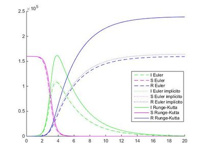 Haremos entonces una serie de cálculos numéricos para las tres condiciones iniciales con paso h=0.001 e I=[0,20], obteniendo tres gráficas para cada condición inicial. Una con la trayectoria de I(t) frente al tiempo en los 3 métodos, otra para S(t) y otra que compare ambas para demostrar que se cumple el triángulo que hemos comentado al inicio.