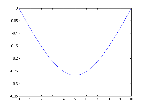 Sabiendo que [math] \ E=5x10^4 , a=0.6 , b=0.3 , M(x)=L/2−|x−L/2|\ [/math], plantaremos un problema de contorno, con objeto de conocer la deformada de la viga al serle aplicado este momento flector.Una vez calculada la deformada estudiaremos sus puntos y encontraremos el de mayor deflexión (mayor y). Para realizar estos cálculos empleamos el siguiente código de matlab.