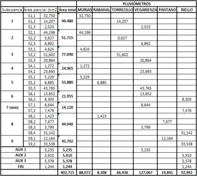 Una vez obtenida la cuenca hidrográfica y realizada la división en subcuencas se procede a aplicar el Método de los Polígonos de Thiessen para calcular la precipitación media areal de la cuenca, pero para ello es necesario incluir en el programa QGIS los pluviometros de AEMET. La introducción de los mismos se realiza a través de un documento en formato .txt que se introduce en el programa como una capa vectorial nueva. Tras ello aplicamos una ''herramienta de geometría'' de las capas vectoriales llamada ''polígonos de Voronoi'' que nos realiza una nueva capa vectorial de polígono con diversos polígonos cuyos baricentros son los pluviómetros.