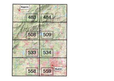 Se ha empleado como base las hojas 483, 484, 508, 509, 533, 534, 558 y 559 del Mapa Topográfico Nacional a escala 1:50.000 (MTN50) en formato raster (FIGURA 1).