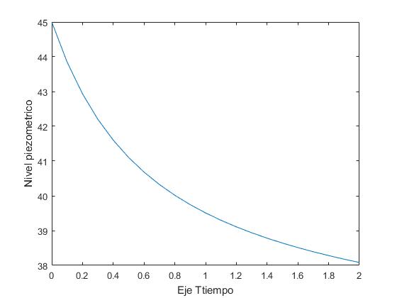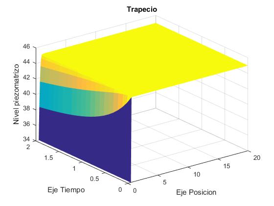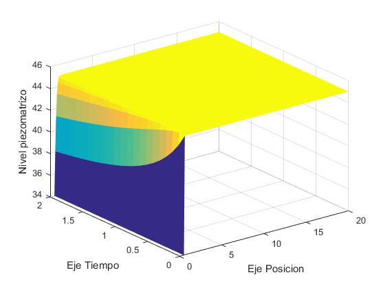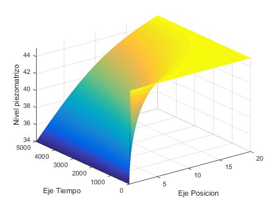 end %definimos la condicion dirichlet Hb=hb(t); %formulamos la solucion Y=[y;Hb]; %hacemos el grafico de la solucion en 3d %mallamos [Mt,Mx]=meshgrid(t,x); surf(Mx,Mt,Y) shading flat xlabel('Eje Posicion');ylabel('Eje Tiempo'); zlabel('Nivel piezomatrizo');