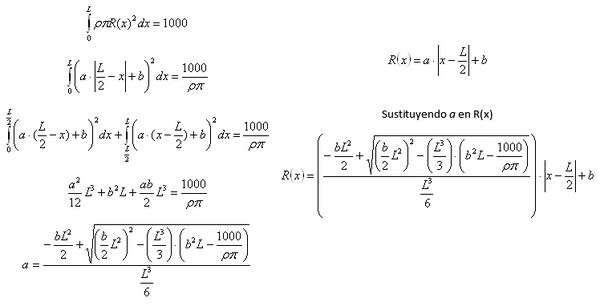 Ahora vamos a suponer que la sección circular de la columna depende de "x", según la siguiente fórmula: [math]R(x)=a·|x-L/2|+b[/math] También se considera la masa constante, [math]m=1000Kg[/math]. A continuación vamos calcular la sección de la columna siguiendo la fórmula anterior, dando diferentes valores al parámetro b. Para ello es necesario poner el radio sólo en función de b. Como la masa es constante para todas las columnas que podemos formar variando b y su longitud no varia, entonces se puede poner la fórmula del radio en función de un sólo parámetro (en este caso b).