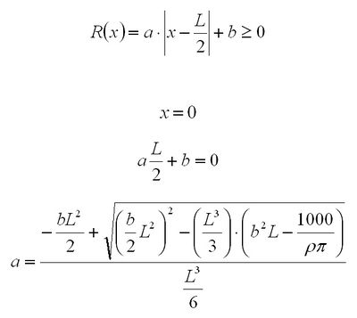 Ahora vamos a suponer que la sección circular de la columna depende de "x", según la siguiente fórmula: [math]R(x)=a·|x-L/2|+b[/math] También se considera la masa constante, [math]m=1000Kg[/math]. A continuación vamos calcular la sección de la columna siguiendo la fórmula anterior, dando diferentes valores al parámetro b. Para ello es necesario poner el radio sólo en función de b. Como la masa es constante para todas las columnas que podemos formar variando b y su longitud no varia, entonces se puede poner la fórmula del radio en función de un sólo parámetro (en este caso b). En la siguiente imagen se muestra el desarrollo de dicha operación, como se puede observar al final R(x) depende únicamente del parámetro b.