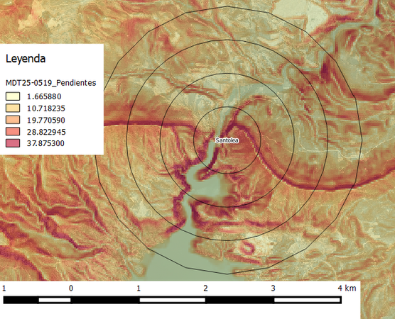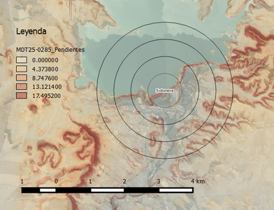 Se contrasta con la capa que contiene las zonas con velocidades medias de viento (verde azulado) superiores a 4 m/s, obteniendo las mejores localizaciones para un posible parque eólico: