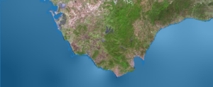 Hemos empezado delimitando nuestra zona de estudio a un rectángulo de 193 kilómetros de ancho por 80 kilómetros de alto en el cual se incluyen las costas de Cádiz, Tarifa y Marbella. En la imagen también se puede observar las profundidades de la zona y, el primer problema que nos surge es que la máxima profundidad a la que pueden situarse los aerogeneradores es de 50 metros. Para centrarnos en las zonas donde sí podemos construir realizaremos un buffer desde la costa hasta las profundidades de 50 metros.
