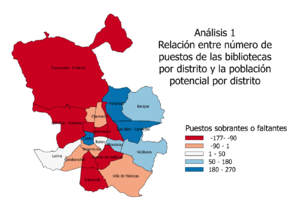 En este primer análisis se ha hecho uso de la capa con los distritos y una capa de las poblaciones por edades. El objetivo de este análisis es el estudio de la ocupación de cada biblioteca: comprobar en cada distrito si las bibliotecas abastecen a toda la población potencial a usar la biblioteca.