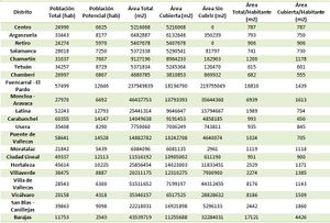 En la tabla de atributos correspondiente a la nueva capa, obtenemos el área que cubren las bibliotecas por distrito, área total de cada distrito, población total, población potencial y el nombre de los distintos distritos. En la tabla creamos dos campos nuevos, uno que se llama “Área Total/ Habitante” (representa el área que correspondería a cada habitante potencial de biblioteca según el distrito), y otro que es “Área Cubierta/Habitante” (representa el área de distrito que por habitante potencial se encuentra con cobertura de bibliotecas municipales).Estos dos campos nos permiten analizar la situación de cada distrito, ver en cuál de ellos es insuficiente, y en cuáles hay dotación excesiva de bibliotecas por habitante potencial.