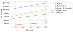 Evolución del coste total en ambos aliviadero para el caudal vertido. Nótese que cada punto de este gráfico se obtiene como resultado de un proceso de optimización, por que representa en cada caso un óptimo