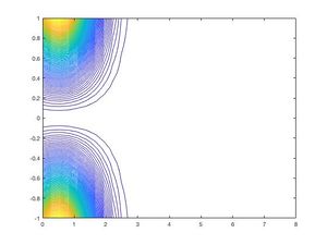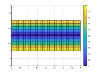 Los puntos de mayor rotacional se encuentran en las paredes del canal. Representamos el módulo del rotacional del campo [math] \vec u [/math], que sería la función [math]|\nabla\times\vec{u}| = {y} [/math]. Programando en Matlab: