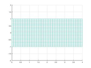 En primer lugar comenzaremos dibujando un mallado que represente los puntos interiores del rectángulo [0, 8] × [−1, 1] ocupado por un fluido. Fijaremos los ejes en la región [0, 4] × [−2, 2].