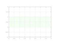 Consideramos una placa plana (en dimensión 2) que ocupa la región [math] [-1/2,1/2] \times [0,2][/math]. En ella vamos a suponer que tenemos definidas dos cantidades físicas: la temperatura [math]T(x,y,t)[/math], que depende de las dos variables espaciales [math](x,y)[/math] y el tiempo [math]t[/math], y los desplazamientos [math]\vec u(x,y,t)[/math]. De esta forma, si definimos [math]r_0(x,y)[/math] el vector de posición de los puntos de la placa en reposo, la posición de cada punto [math](x,y)[/math] de la placa en un instante de tiempo [math]t[/math] viene dada por: [math] \vec r (x,y,t)= \vec r_{0}(x,y)+\vec u(x,y,t). [/math] Vamos a suponer que sobre la placa se ha aplicado una fuerza que ha provocado una vibración de manera que los desplazamientos vienen dados por la onda: [math] \vec u(x,y,t) = \vec a \sin(\vec b \cdot \vec r_0-ct), [/math] donde [math]\vec a[/math] se conoce como amplitud, [math]\vec b[/math] es la fase que indica la dirección de propagación y [math]c/|\vec b|[/math] es la velocidad de propagación.