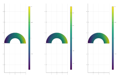 Consideramos una placa plana que ocupa la mitad de un anillo circular centrado en el origen y comprendido entre los radios 1 y 2, en el plano y ≥ 0. En ella vamos a suponer que tenemos definidas dos cantidades físicas: la temperatura \(T(x,y,t)\), que viene dada por [math]T(x, y) = log((x − 3)^2 + 2)[/math], y los desplazamientos \(\vec u(x,y,t)\) producidos por la acción de una fuerza determinada. De esta forma, si definimos \(r0(x,y)\) el vector de posición de los puntos de la placa en reposo, la posición de cada punto \((x,y)\) de la placa después de la deformación viene dada por \(\vec r\)(x, y) = ~\(\vec r\)0(x, y) + ~\(\vec u\)(x, y)\). Vamos a suponer que la fuerza aplicada sobre la placa ha provocado un desplazamiento de los puntos de la misma dado por el vector de desplazamientos [math]\vec u(ρ, θ) = ρ − 1 5 sin(θ)~[/math]\(\vec e\)θ.