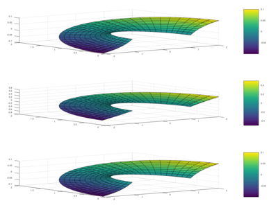 Como podemos apreciar al comparar estas dos gráficas, el desplazamiento producido por el campo u ha creado una ligera torsión radial en la placa.