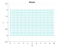 Dibujar un mallado que represente los puntos interiores del sólido. Tomar los ejes (comando axis) en el rectángulo [math](x, y) ∈ [−0.5; 10.5] × [−0.5; 2.5][/math] y como paso de muestreo [math]h = 2/10[/math] para las variables [math]x[/math] e [math]y[/math]. Comenzamos el programa utilizando los programas de limpieza para borrar todos los anteriores. Creamos el paso de muestreo [math]h[/math] y definimos los parámetros de la placa [math]x[/math] e [math]y[/math]. Creamos el mallado con el comando meshgrid() y, a continuación, dibujamos el mallado con mesh() habiendo definido ya las matrices [math]X, Y, Z[/math] (siendo esta última 0). Finalmente, ajustamos los ejes a los límites establecidos, los nombramos y ponemos un título al gráfico.