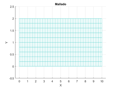 Dibujar un mallado que represente los puntos interiores del sólido. Tomar los ejes (comando axis) en el rectángulo [math](x, y) ∈ [−0.5; 10.5] × [−0.5; 2.5][/math] y como paso de muestreo [math]h = 2/10[/math] para las variables [math]x[/math] e [math]y[/math]. Comenzamos el programa utilizando los programas de limpieza para borrar todos los anteriores. Creamos el paso de muestreo [math]h[/math] y definimos los parámetros de la placa [math]x[/math] e [math]y[/math]. Creamos el mallado con el comando meshgrid() y, a continuación, dibujamos el mallado con mesh() habiendo definido ya las matrices [math]X, Y, Z[/math] (siendo esta última 0). Finalmente, ajustamos los ejes a los límites establecidos, los nombramos y ponemos un título al gráfico.