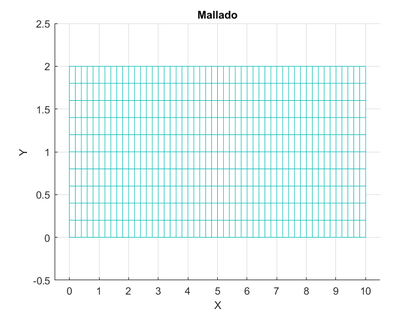 Consideramos una placa rectangular plana (en dimensión 2) que ocupa la región [math](x, y) ∈ [0, 10]×[0, 2][/math]. En ella vamos a suponer que tenemos definidas dos cantidades físicas: la temperatura [math]T(x, y)[/math], que viene dada por,