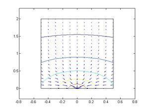 %definimos las componentes del campo U Ux=0; Ux=(pi*cos(pi*vv))/10; quiver(uu,vv,Ux,0*uu) axis([-0.8,0.8,-0.3,2.3]) view([0,0,1])