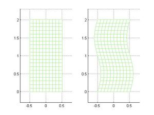 Consideremos ahora [math]\vec u(x,y)=\frac{\sin(\pi y)}{10}\vec i[/math] un campo vectorial que determine el desplazamiento de los puntos del mallado. Al aplicarlo sobre el conjunto representa el cambio de posición de cada uno de los puntos del sólido.