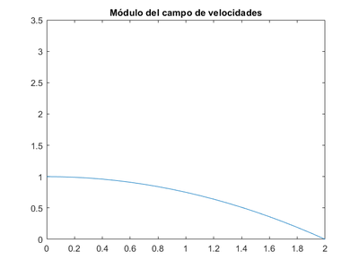 Según la Ley de Poiseuille la velocidad en las paredes o lateral del tubo debería ser nula, tal y como se muestra en la segunda imagen. En nuestro caso, la velocidad en el lateral [math] \rho =2 [/math] es nula, y la velocidad máxima se encuentra en el extremo opuesto, es decir, [math] \rho =0 [/math], como podemos observar en el gráfico realizado con Matlab.