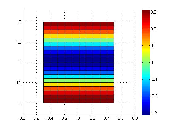 Consideremos ahora [math]\vec u(x,y)=\frac{\sin(\pi y)}{10}\vec i[/math] un campo vectorial que determine el desplazamiento de los puntos del mallado. Al aplicarlo sobre el conjunto representa el cambio de posición de cada uno de los puntos del sólido.