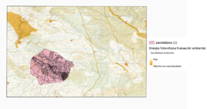 Primeramente, hemos utilizado como guía para asegurarnos de que la zona de parcelas de posible instalación es óptima a la vista del medioambiente utilizando una capa WMS, donde se observa en naranja fuerte los sectores donde el ministerio recomienda no poner la instalación fotovoltaica debido a una alta sensibilidad ambiental.