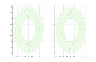 Consideramos una placa plana (en dimensión 2) que ocupa el anillo comprendido entre las circunferencias centradas en el origen de radios 2 y 1. En ella vamos a suponer que tenemos definidas dos cantidades físicas: la temperatura [math]T(\rho,\theta,t)[/math], que depende de las dos coordenadas polares [math](\rho,\theta)[/math] y el tiempo [math]t[/math], y los desplazamientos [math]\vec u(\rho,\theta,t)[/math]. De esta forma, si definimos [math]r_0(\rho,\theta)[/math] el vector de posición de los puntos de la placa en reposo, la posición de cada punto [math](\rho,\theta)[/math] de la placa en un instante de tiempo [math]t[/math] viene dada por: [math] \vec r (\rho,\theta,t)= \vec r_{0}(\rho,\theta)+\vec u(\rho,\theta,t). [/math] Vamos a suponer que sobre la placa se ha aplicado una fuerza que ha provocado una vibración de manera que los desplazamientos en un tiempo [math]t_0[/math] dado vienen dados por: [math] \vec u(\rho,\theta)=\frac{\sin(\pi \theta/2)}{30\rho}\vec g_{\rho}. [/math]