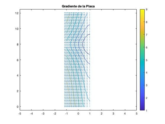 Comenzamos definiendo todas las variables incluyendo la función temperatura y el mallado. A continuación, se calcula y se representa el gradiente en la gráfica.