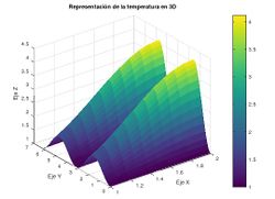 Usando el código de matlab mostraremos la interpretación gráfica del campo escalar que representa la temperatura del fluido. Para representar el campo escalar se hará con la ayuda de Matlab y así estudiará el gradiente de la temperatura. Hemos hecho dos graficas para poder visualizar correctamente la grafica. La primera la veremos en 3D, observando donde se puede situar el máximo de la temperatura. En la segunda imagen podemos observar la misma figura pero representada en el eje x,y (usando pcolor), teniendo una vista desde arriba donde contemplamos los tonos tanto de frio como de calor. Para poner la barra de temperatura a la derecha ponemos (colorbar). Y terminamos insertando los ejes (_label) y el titulo (title)