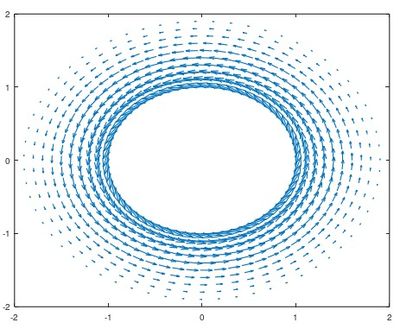 Cuando [math]\ \omega =1 [/math] y [math]\ \mu=1 [/math] el campo de velocidades resulta ser el siguiente: