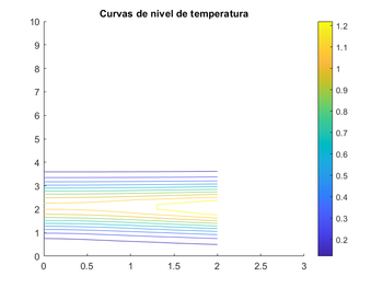 Las curvas de nivel de un campo de temperaturas unen los puntos que se encuentran a la misma temperatura dentro del campo estas curvas son conocidas como isotermas. Estas las vamos a representar por colores las temperaturas al igual que el campo de temperaturas siendo los colores azules los más fríos y los amarillos/rojos los más cálidos.