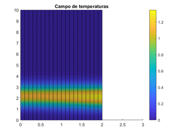 El campo de temperaturas es un campo escalar ya que cada punto tiene una temperatura diferente al resto. Suele depender de la posición del punto y del tiempo para determinar la temperatura de ese punto. La temperatura del fluido nos viene determinada por el campo escalar:[math] T(ρ{,}θ{,}z)=log(1+ρ)e^{-(z-2)^2}[/math]