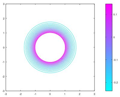 Suponiendo que los dos cilindros tiene 1 metro de profundidad y la velocidad del fluido, con el campo calculado en el apartado 3, en m/s vine dado por la forma: [math]\ \vec u(\rho ,\theta ) = (-\frac{1}{3}\rho+\frac{4}{3\rho})\vec{e_{\theta }} [/math]