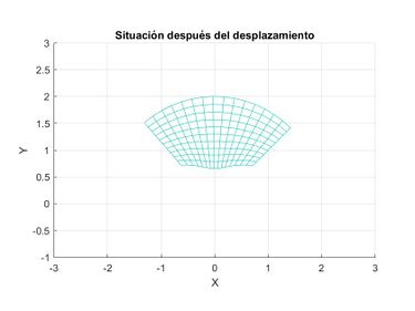 Para el dibujo del mallado se tomará la región dada: una parte de un anillo. Como paso de muestreo para las variables [math]x[/math] e [math]y[/math], tomaremos [math]\frac{1}{10}[/math], contrariamente a los [math]\frac{2}{10}[/math] que propone el enunciado. Esto, es debido a que un paso de muestreo menor produce una malla con más puntos, y por lo tanto, con más detalle. Es por ello, que la elección de [math]\frac{1}{10}[/math] proporciona un buen balance entre detalle y claridad para todos los problemas planteados a lo largo de este artículo.