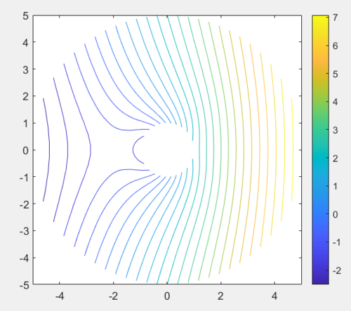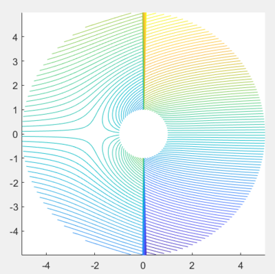 En el presente artículo se analizará el comportamiento del flujo de un fluido incompresible alrededor de un obstáculo de forma circular, visualizando sus campos vectoriales y escalares. En el supuesto dado, el obstáculo se tratará de un anillo de radio 1, cuyo centro se encontrará en el origen de coordenadas y cuyo flujo estará definido por la siguiente función potencial: