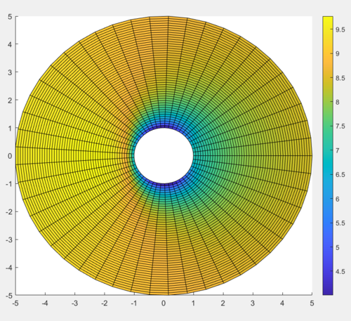 Para representar los puntos de la región ocupada por el fluido, se comenzará generando un mallado que describa el anillo situado entre los radios 1 y 5, con el origen de coordenadas como centro. Este proceso implica la creación de un conjunto de puntos distribuidos en coordenadas polares, el cual permitirá la visualización del mallado buscado. Se dibujarán los ejes en el intervalo [math](x,y) ∈ [-5,5]\times[-5,5] [/math].