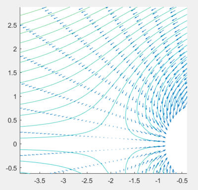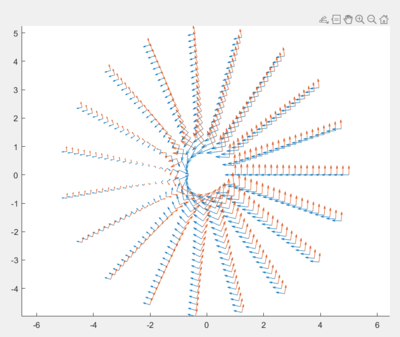 Se verifica representando gráficamente que [math]\vec v[/math] y el campo de velocidades [math]\vec u[/math] son ortogonales, adjuntando también el código de Matlab correspondiente: