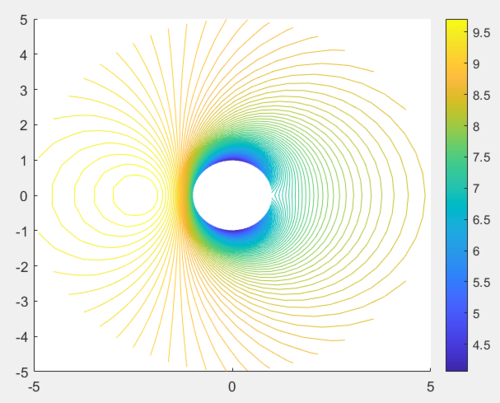 hold offInterpretando el gráfico, se comprueba que la velocidad en los puntos correspondientes a [math]\theta=\frac{\pi}{2}[/math] y [math]\theta=\frac{3\pi}{2} [/math] es máxima, ya que el módulo del vector es considerablemente superior al resto del campo. Igualmente, se verifica que no hay ningún punto de remanso, pues no hay ningún punto en el borde del obstáculo donde la velocidad es cero.