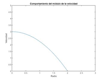 En la gráfica podemos observar el comportamiento del módulo de la velocidad. Vemos también como el máximo de la velocidad se alcanza en [math]\rho={0}[/math], en el eje de la tubería tomando un valor de [math]{3}[/math] y que disminuye según nos acercamos a las paredes de la tubería donde la velocidad se hace nula.