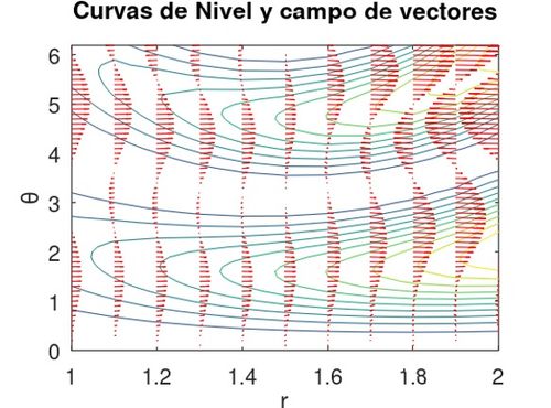 quiver(R, TH, Gx, Gy, 'Color', 'r');                  % Dibuja un campo de vectores sobre las curvas de nivel