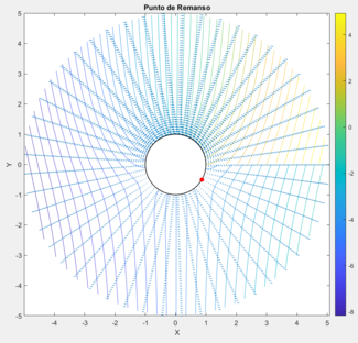 Para calcular el punto de remanso se ha de igualar |[math]\vec{u}[/math]| a 0 y despejar el valor de [math]\theta[/math]: