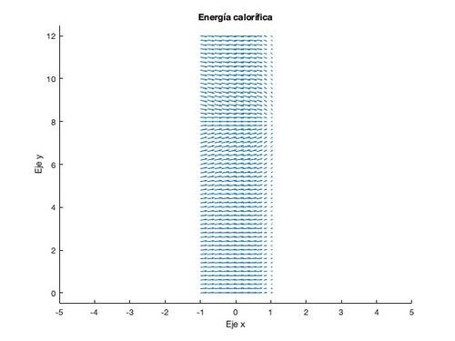 Para la resolución de este apartado se reutilizará el código del apartado anterior y se hará uso de la función gradiente propia del programa MATLAB. Una vez calculado el gradiente, lo multiplicamos por la constante de conductividad térmica [math] k [/math] y representamos en una gráfica la energía calorífica [math] \vec{Q} [/math] como campo vectorial.
