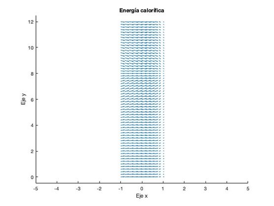 Para la resolución de este apartado se reutilizará el código del apartado anterior y se hará uso de la función gradiente propia del programa MATLAB. Una vez calculado el gradiente, lo multiplicamos por la constante de conductividad térmica [math] k [/math] y representamos en una gráfica la energía calorífica [math] \vec{Q} [/math] como campo vectorial.