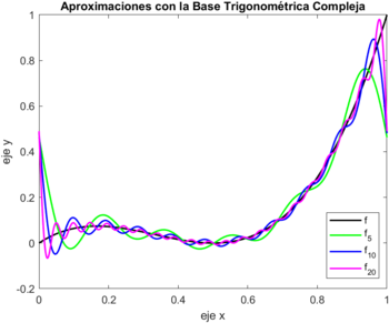 Por último, vamos a considerar la base trigonométrica compleja, que viene dada por [math] \left\{ e^{\frac{2\pi inx}{b-a}}\right\} _{n \in \mathbb{Z} }[/math] en [math][a, b] [/math].