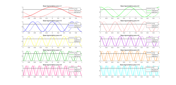 En la siguiente gráfica se representa esta base para los 10 primeros términos con [math][a,b]=[-1,1][/math], correspondiendo la recta negra a la función [math]1/2[/math] , y representados en línea continua y punteada [math]\cos{\left(n\pi x\right)}[/math] y [math]\sin{\left(n\pi x\right)}[/math], respectivamente.