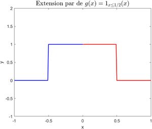 title('Extension par de $g(x)=1_{x\leq 1/2}(x)$','Interpreter','latex',FontSize=15)
