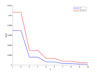 Aunque a simple vista se ve que la aproximación es buena, vamos a comprobarlo utilizando los errores en la norma [math] L^2 [/math] y en la uniforme.